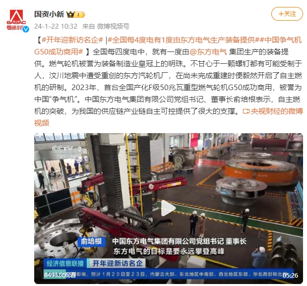 【#開(kāi)年迎新訪(fǎng)名企#|#全國(guó)每4度電有1度由東方電氣生產(chǎn)裝備提供##中國(guó)爭(zhēng)氣機(jī)G50成功商用#】全國(guó)每四度電中,就有一度由@東方電氣集團(tuán)生產(chǎn)的裝備提供。燃?xì)廨啓C(jī)被譽(yù)為裝備制造業(yè)皇冠上的明珠。不甘心于一顆螺釘都有可能受制于人,汶川地震中遭受重創(chuàng)的東方汽輪機(jī)廠(chǎng),在尚未完成重建時(shí)便毅然開(kāi)啟了自主燃機(jī)的研制。2023年,首臺(tái)全國(guó)產(chǎn)化F級(jí)50兆瓦重型燃?xì)廨啓C(jī)G50成功商用,被譽(yù)為中國(guó)“爭(zhēng)氣機(jī)”。中國(guó)東方電氣集團(tuán)有限公司黨組書(shū)記、董事長(zhǎng)俞培根表示,自主燃機(jī)的突破,為我國(guó)的供應(yīng)鏈產(chǎn)業(yè)鏈自主可控提供了很大的支撐。