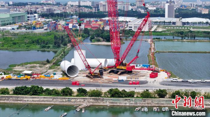 全球單機(jī)容量最大海上風(fēng)電機(jī)組正在廣東風(fēng)電臨海試驗基地進(jìn)行塔筒吊裝。(廣東電網(wǎng)公司 供圖)