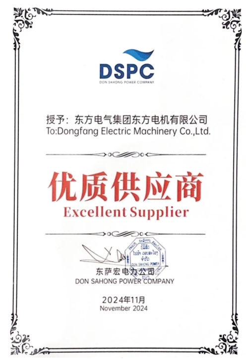 東方電機獲得“優(yōu)質供應商”證書