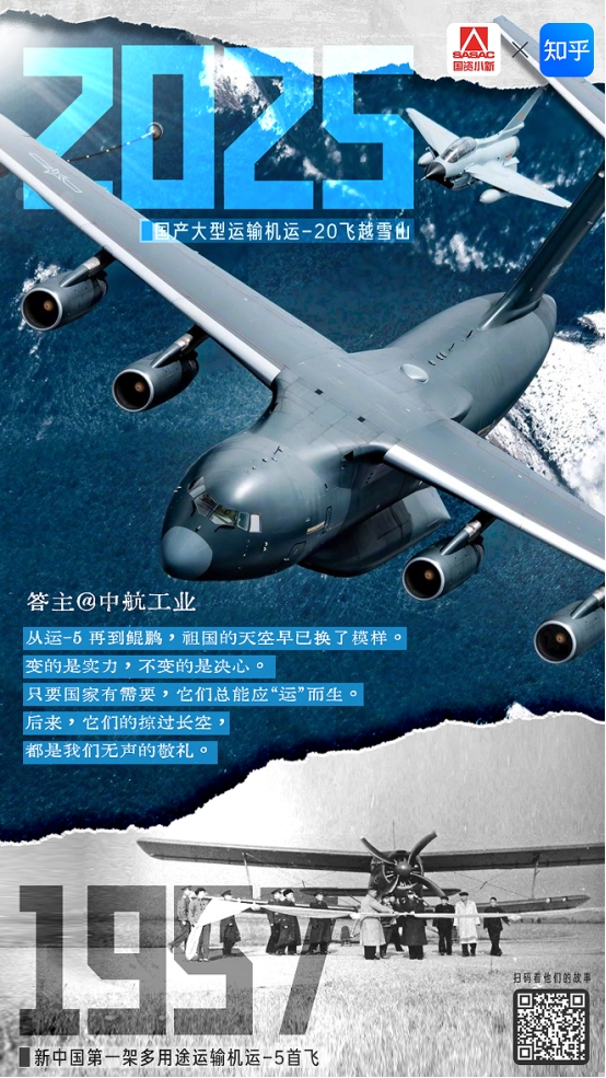 運(yùn)-20“鯤鵬”穿越云層呼嘯而過,47米的機(jī)身已能馱載66噸跨越洲際。運(yùn)-5是起點(diǎn),運(yùn)-20卻不是終點(diǎn),無論何時(shí)何地,只要國家需要,它們總能應(yīng)“運(yùn)”而生。每一次掠過長空,都是我們對(duì)您無聲的致敬。