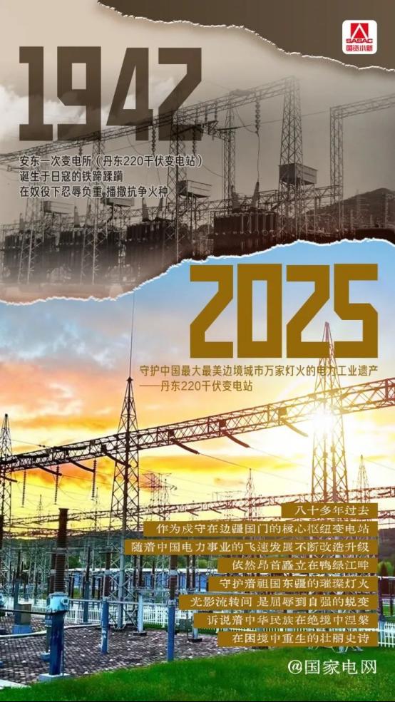 如今,這座變電站與世界領(lǐng)先的智能電網(wǎng)設(shè)備并肩而立,守護(hù)著英雄之城的璀璨燈火。它昂首矗立在鴨綠江畔,多么像您和無數(shù)英雄前輩曾經(jīng)戰(zhàn)斗時(shí)的英姿。