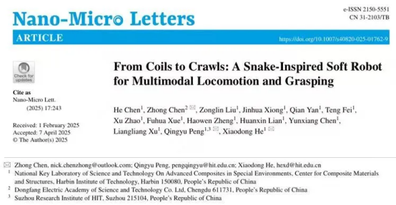 相關(guān)成果以《From Coils to Crawls: A Snake-Inspired Soft Robot for Multimodal Locomotion and Grasping》為題,東方研究院陳仲博士與哈爾濱工業(yè)大學赫曉東院士、彭慶宇教授為共同通訊作者。