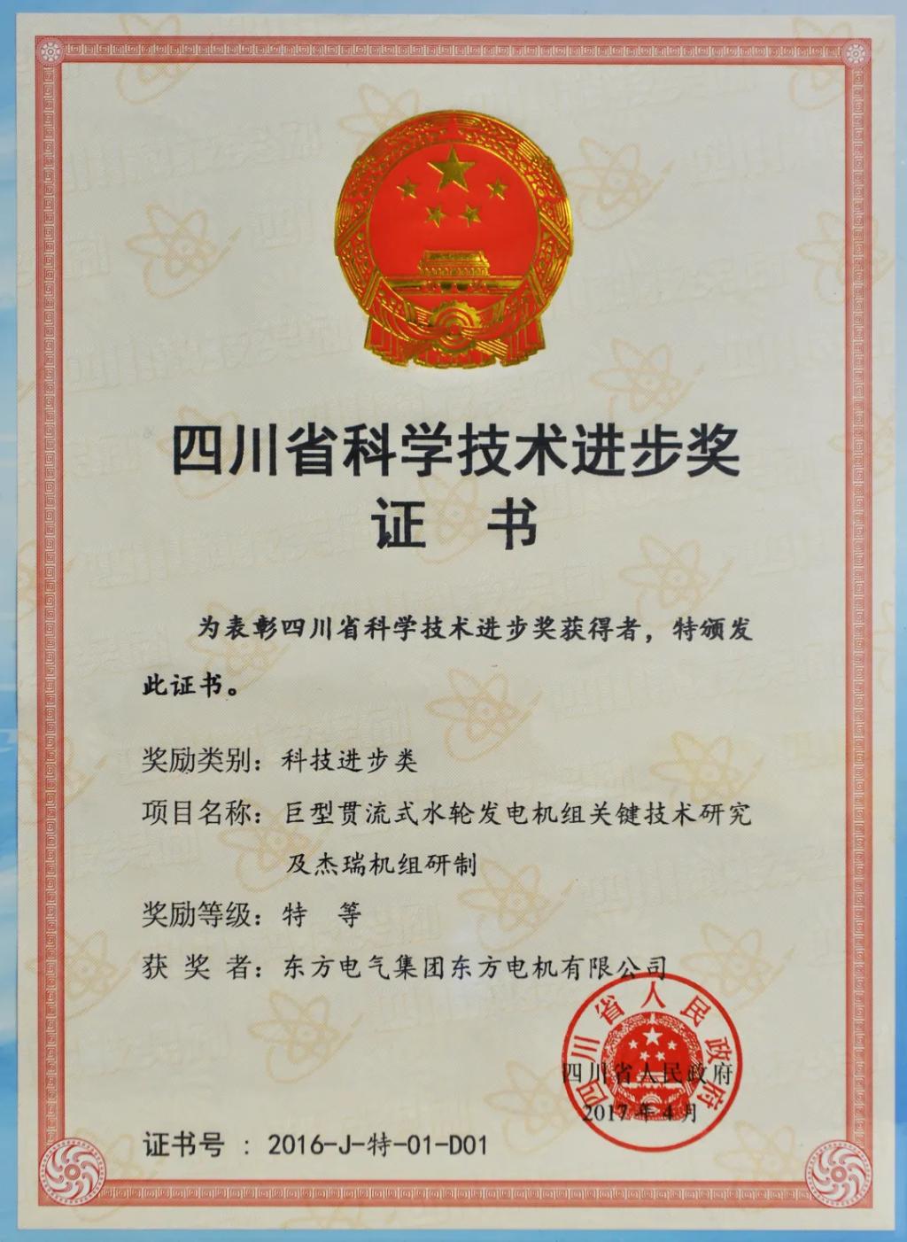 “巨型貫流式水輪發(fā)電機組關鍵技術研究及杰瑞機組研制”獲四川省2016年科學技術進步獎特等獎