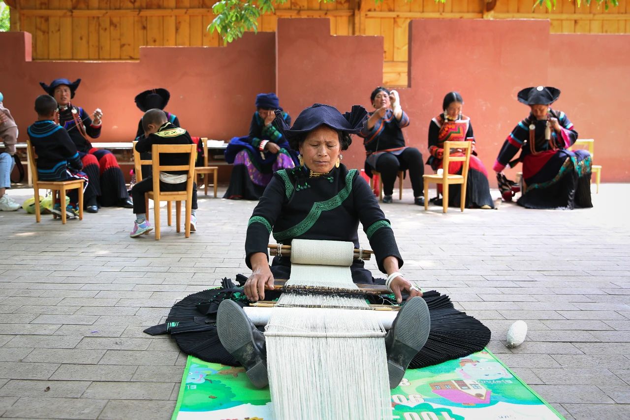 昭覺縣特布洛村村民正在村民活動(dòng)廣場(chǎng)手工染織“查爾瓦”(“查爾瓦”是彝族地區(qū)不論男女都喜歡披的一種羊毛織披氈)
