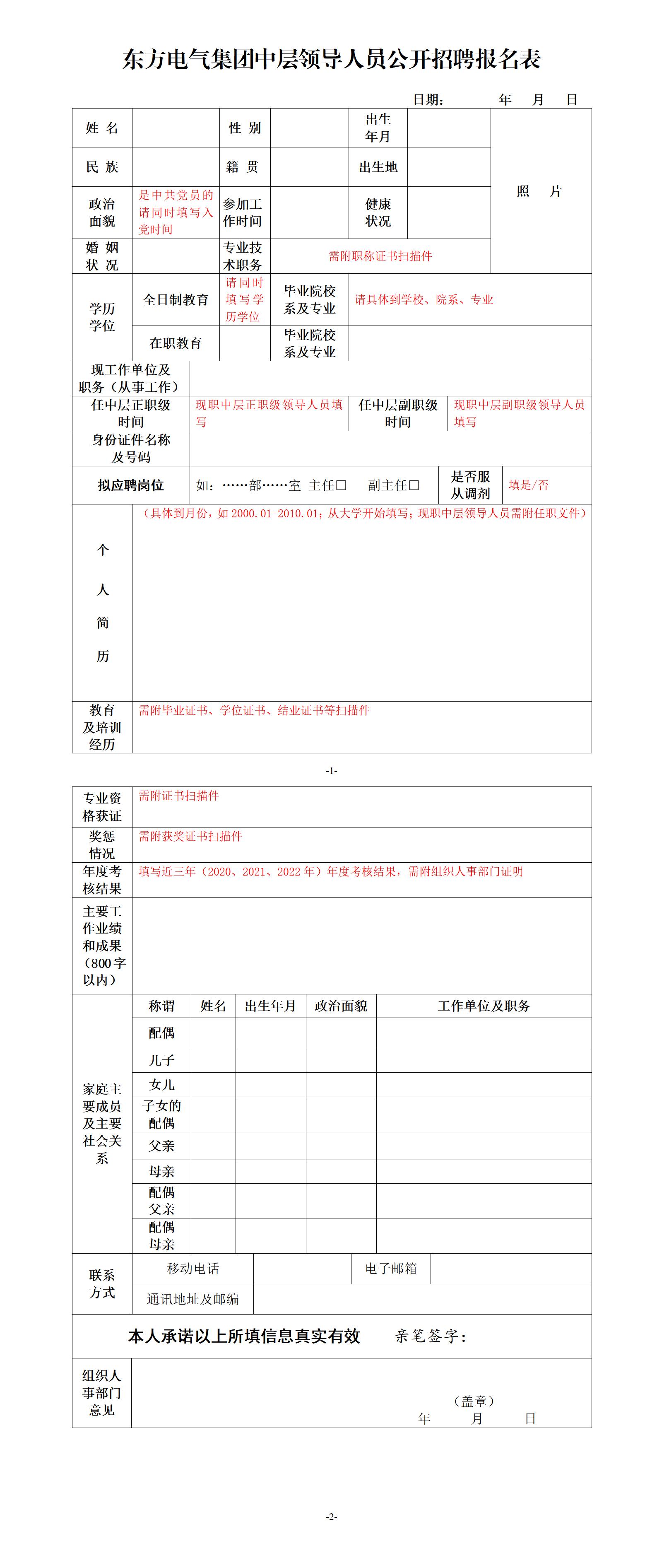東方電氣集團中層領(lǐng)導人員公開招聘報名表