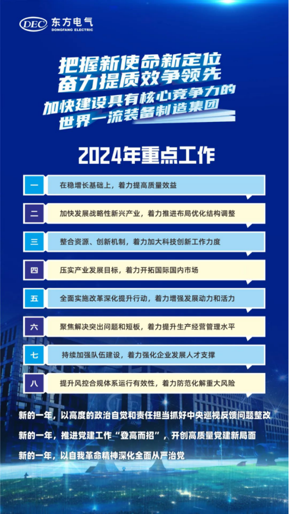 俞培根指出,2024年是落實(shí)“領(lǐng)先戰(zhàn)略”和“11256”發(fā)展戰(zhàn)略,推進(jìn)集團(tuán)公司轉(zhuǎn)型發(fā)展的關(guān)鍵之年,做好全年的工作尤為重要。全集團(tuán)要堅(jiān)持以習(xí)近平新時(shí)代中國(guó)特色社會(huì)主義思想為指導(dǎo),全面貫徹落實(shí)黨的二十大和二十屆二中全會(huì)、中央經(jīng)濟(jì)工作會(huì)議精神,深入貫徹落實(shí)習(xí)近平總書記關(guān)于國(guó)有企業(yè)改革發(fā)展和黨的建設(shè)重要論述,認(rèn)真貫徹落實(shí)習(xí)近平總書記“弘揚(yáng)可貴的‘東汽精神’”“做排頭兵、走在前列”的重要要求,把握國(guó)資央企新使命新定位,完整、準(zhǔn)確、全面貫徹新發(fā)展理念,更好服務(wù)加快構(gòu)建新發(fā)展格局、推進(jìn)新型工業(yè)化,堅(jiān)持穩(wěn)中求進(jìn)、以進(jìn)促穩(wěn)、先立后破,增強(qiáng)核心功能、提高核心競(jìng)爭(zhēng)力,落實(shí)“領(lǐng)先戰(zhàn)略”,強(qiáng)化創(chuàng)新驅(qū)動(dòng),提升經(jīng)濟(jì)效益,持續(xù)推動(dòng)集團(tuán)公司高質(zhì)量發(fā)展,實(shí)現(xiàn)生產(chǎn)經(jīng)營(yíng)質(zhì)的有效提升和量的合理增長(zhǎng),加快建設(shè)具有核心競(jìng)爭(zhēng)力的世界一流裝備制造集團(tuán)。