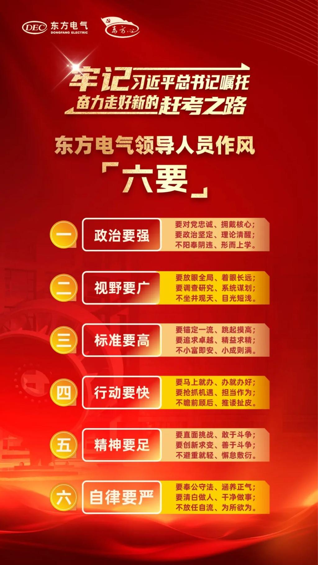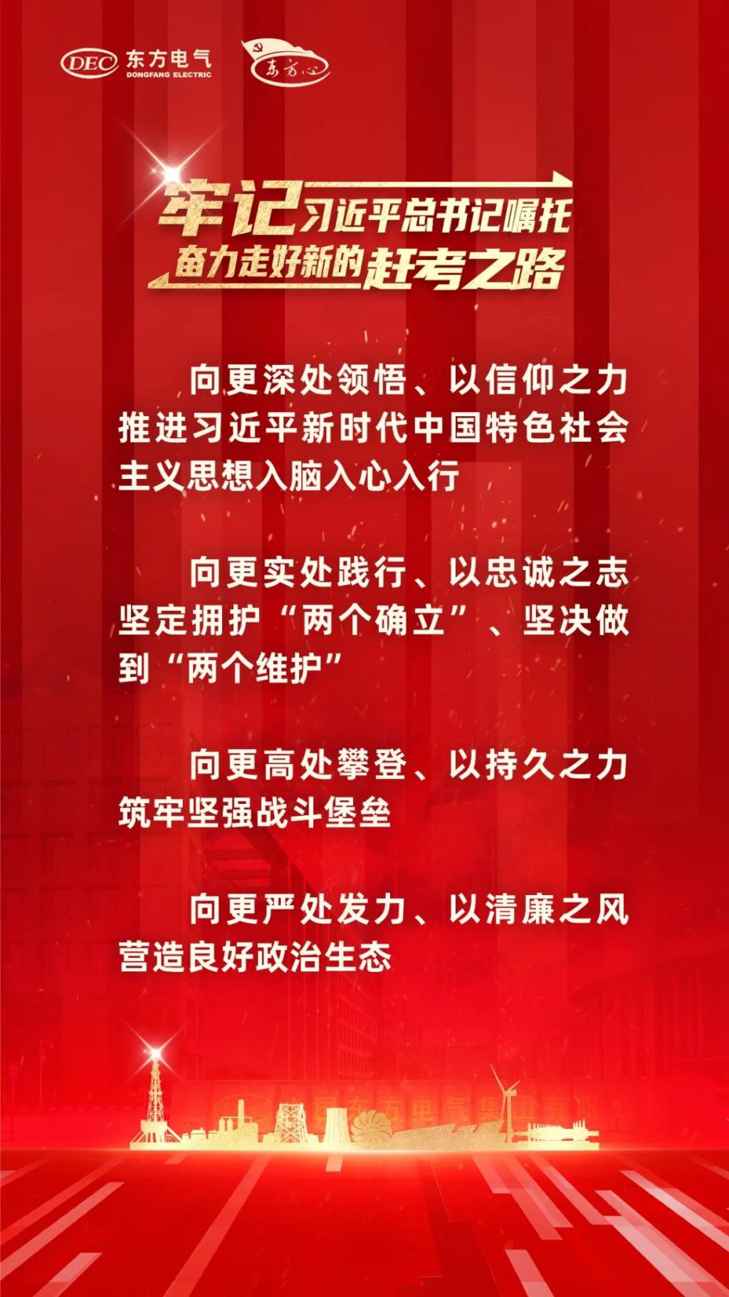 各級黨組織和全體黨員干部職工務(wù)必要以“東方心”黨建品牌為引領(lǐng),以黨建“三年攀高計劃”“登高而招”為牽引,向更深處領(lǐng)悟,向更實處踐行,向更高處攀登,向更嚴(yán)處發(fā)力,接續(xù)奮斗、勇毅前行,形成全集團(tuán)共擔(dān)使命、共譜新篇、攜手奮進(jìn)、萬馬奔騰的生動局面,以東方電氣的“穩(wěn)”“進(jìn)”“立”為全國大局作出新的貢獻(xiàn)。