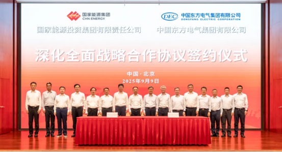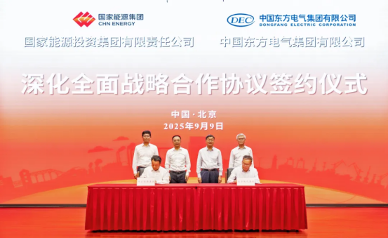 9月9日,中國東方電氣集團有限公司與國家能源投資集團有限責任公司在京簽署深化全面戰(zhàn)略合作協(xié)議。東方電氣集團黨組書記、董事長羅乾宜,總經理、黨組副書記張彥軍,國家能源集團黨組書記、董事長鄒磊,總經理、黨組副書記馮來法共同見證協(xié)議簽署。東方電氣集團黨組成員、副總經理王軍,國家能源集團黨組成員、副總經理傅振邦代表雙方簽署協(xié)議。