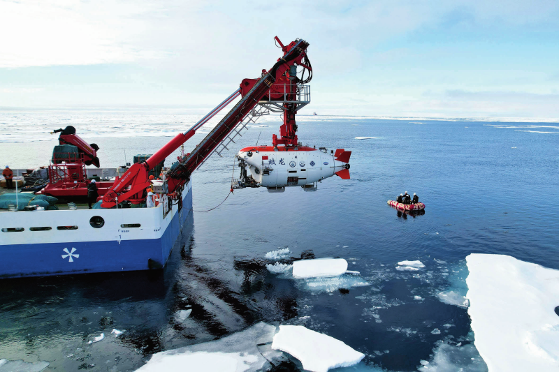 ??在中國大洋92航次第一航段中,“蛟龍”號載人潛水器實現(xiàn)我國首次北極冰區(qū)載人深潛,并在北極海域成功完成了10余次載人深潛。圖為“蛟龍”號在北極冰區(qū)準備下潛(2025年8月11日攝)。劉詩平攝/本刊