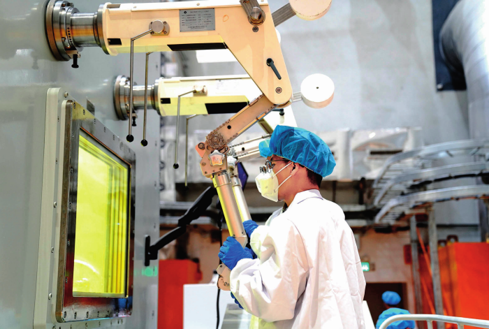 ??在中國科學院上海應用物理研究所武威園區(qū),科研人員在2兆瓦液態(tài)燃料釷基熔鹽實驗堆加料-取樣熱室工作(2025年10月24日攝)。張建松攝/本刊
